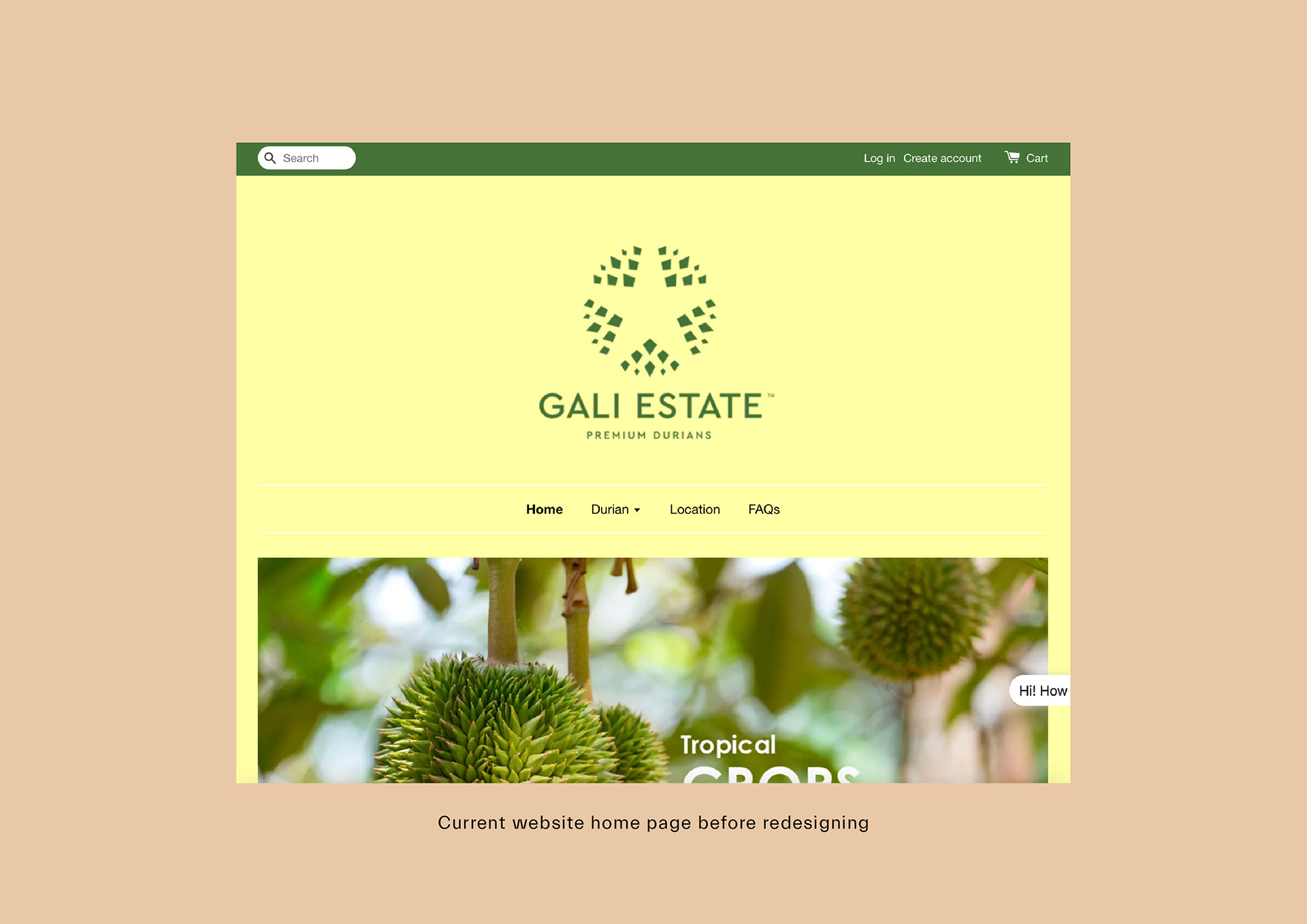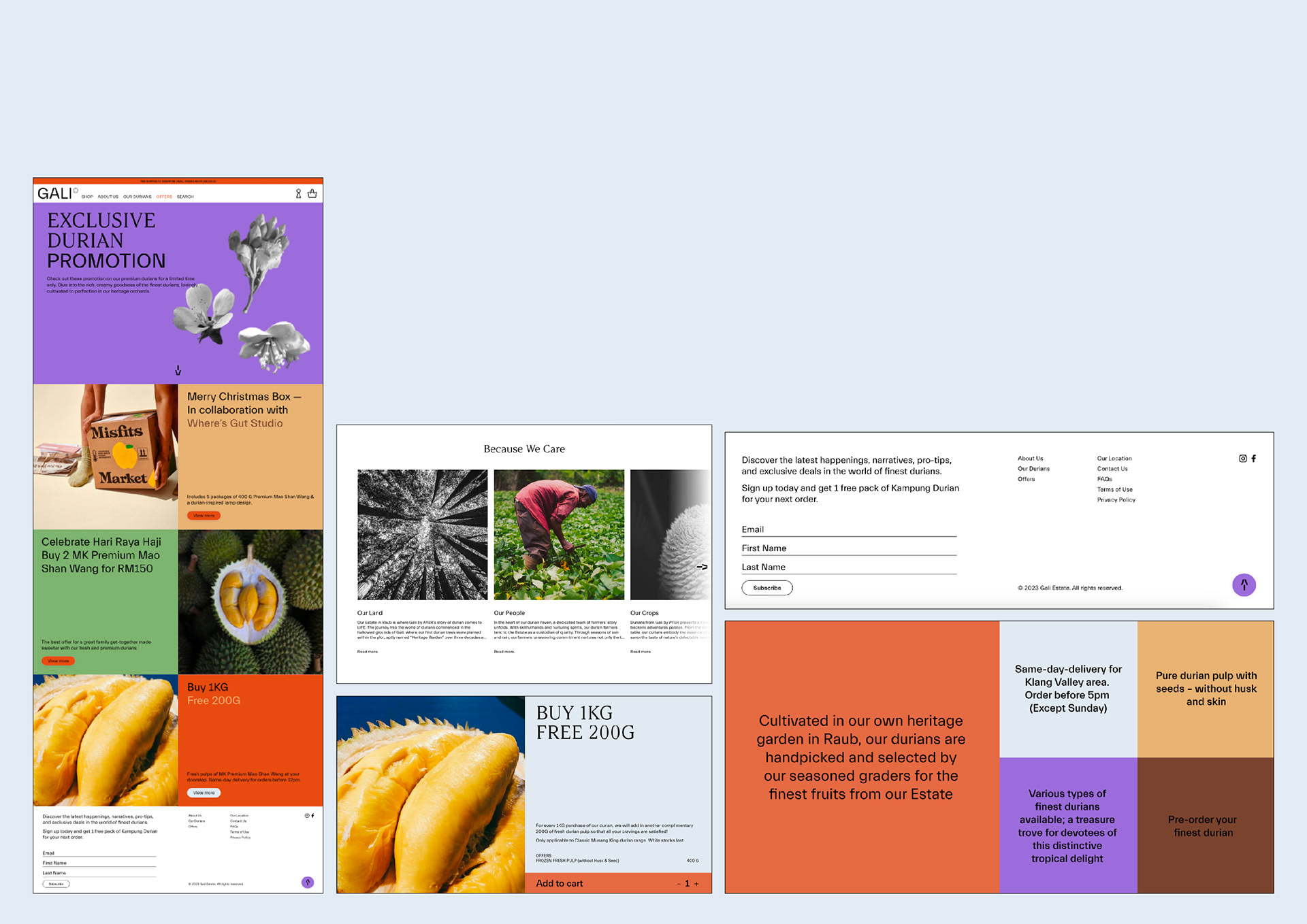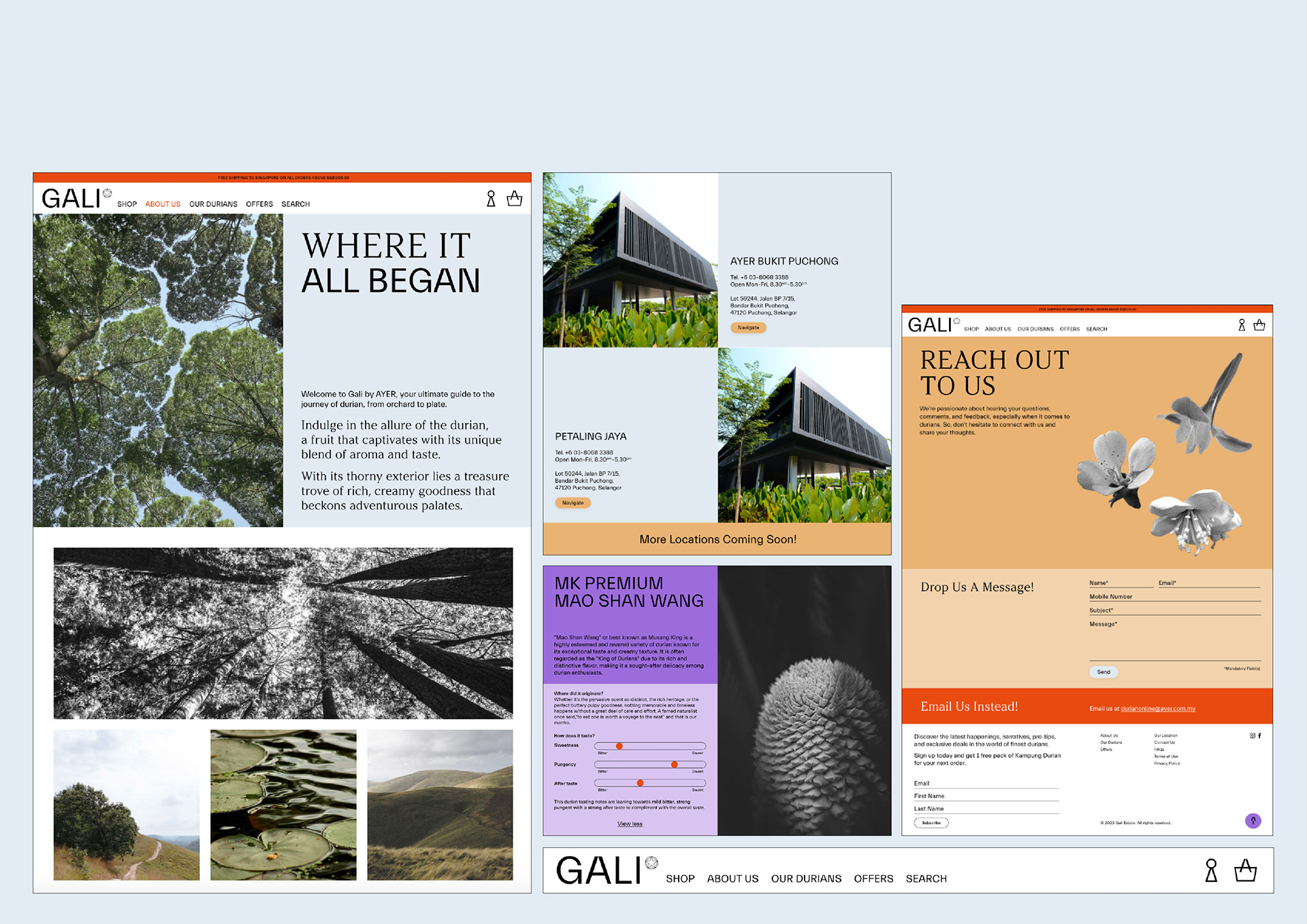 A simple web design for a durian supplier Gali Estate. The redesign focuses on simple information hierarchy, smooth call-to-action flow for all users and web layouts that are easy to interact with. Work is done under Where's Gut Design Studio.